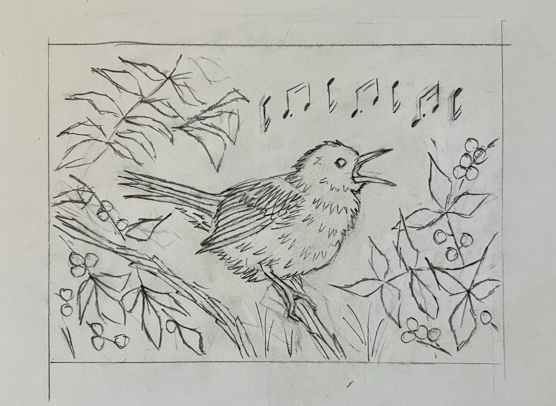 Started out this morning to re-carve my “angry wren” carving only to decide I wanted to do more with it. (The present half-life of my satisfaction with my carvings is maybe six months. He has these little hairy feathers… right here…) Wound up down a rabbit hole (wren hole?) trying to figure out how to transcribe a Carolina wren’s song in musical notation, and eventually bought this book, which I guess I can justify as a business expense. This, meanwhile, was my attempt to write it down.